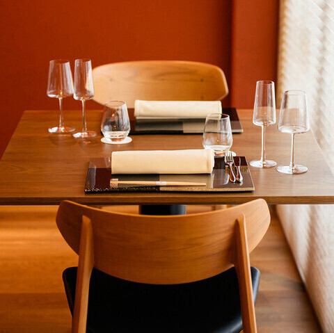 ■特別な日に二人だけの大切な時間を■ 2名掛けのテーブル席は、周囲とほどよく距離があり、二人だけの時間をゆっくりと楽しめる特等席。記念日デートやにぴったりな空間で、食事を楽しみながら自然と会話が弾みます。さりげない非日常感も魅力のひとつです。